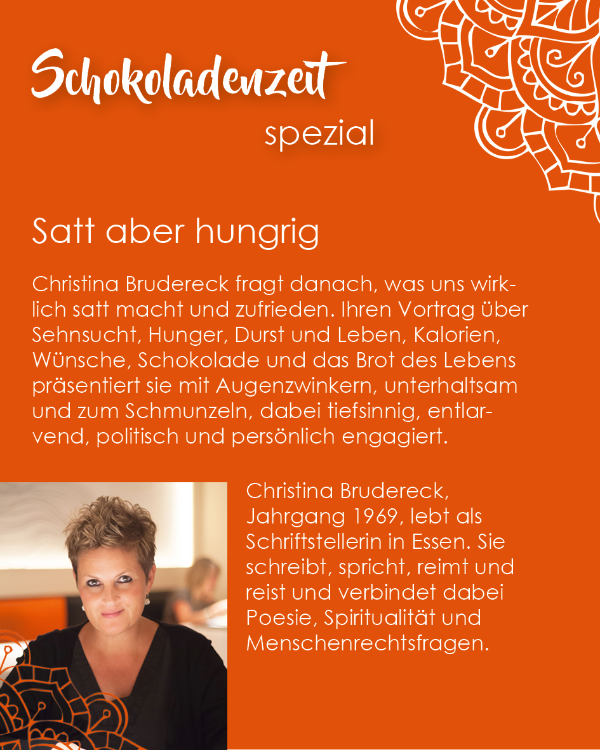 Vortrag über Sehnsucht, Hunger, Durst und Leben, Kalorien, Wünsche, Schokolade und das Brot des Lebens präsentiert sie mit Augenzwinkern, unterhaltsam und zum Schmunzeln, dabei tiefsinnig, entlarvend, politisch und persönlich engagiert. Christina lässt Frauen aus Afrika und Kinder aus Indien zu Wort kommen und rät am Ende nicht zur Diät, sondern fordert dazu auf, sich niemals abspeisen zu lassen.