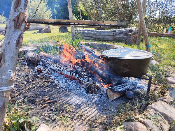 Der Tag schließt mit einer großen Aktion in der ganzen Gruppe ab. Mit Wasserspielen haben wir uns vor der Hitze gerettet, bei einem Geländespiel unsere Strategie und unseren Teamgeist auf die Probe gestellt. Im Wald haben wir entdeckt, gebaut, balanciert und gestaunt. Zum Schluss der Woche wartet immer das Highlight: Alle zusammen bereiten ein Mittagessen vor, das über dem Feuer gekocht wird. Dieses Mal gab es Zucchini-Schnitzel mit Kartoffeln und frischem Salat – direkt auf unserem Feld geerntet und zubereitet. Selten fallen Anbau, Ernte, Verarbeitung und Verzehr so nah zusammen: Die Kinder konnten alles vom Wachsen der Pflanze bis auf den Teller nachvollziehen und beobachten. Hier durften die Eltern auch schon eine Stunde früher dazukommen und mit den Kindern zusammen leckeres Lagerfeuer-Popcorn zum Nachtisch machen.